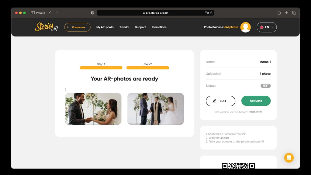 Creating AR is simple, with 2 easy steps: upload files to Stories AR and share the generated QR code with your client. You can animate any image, making your work unique and memorable.