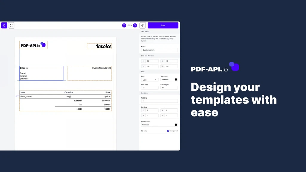 With PDF-API.io’s drag-and-drop editor, creating professional PDFs is as easy as placing elements where you need them.