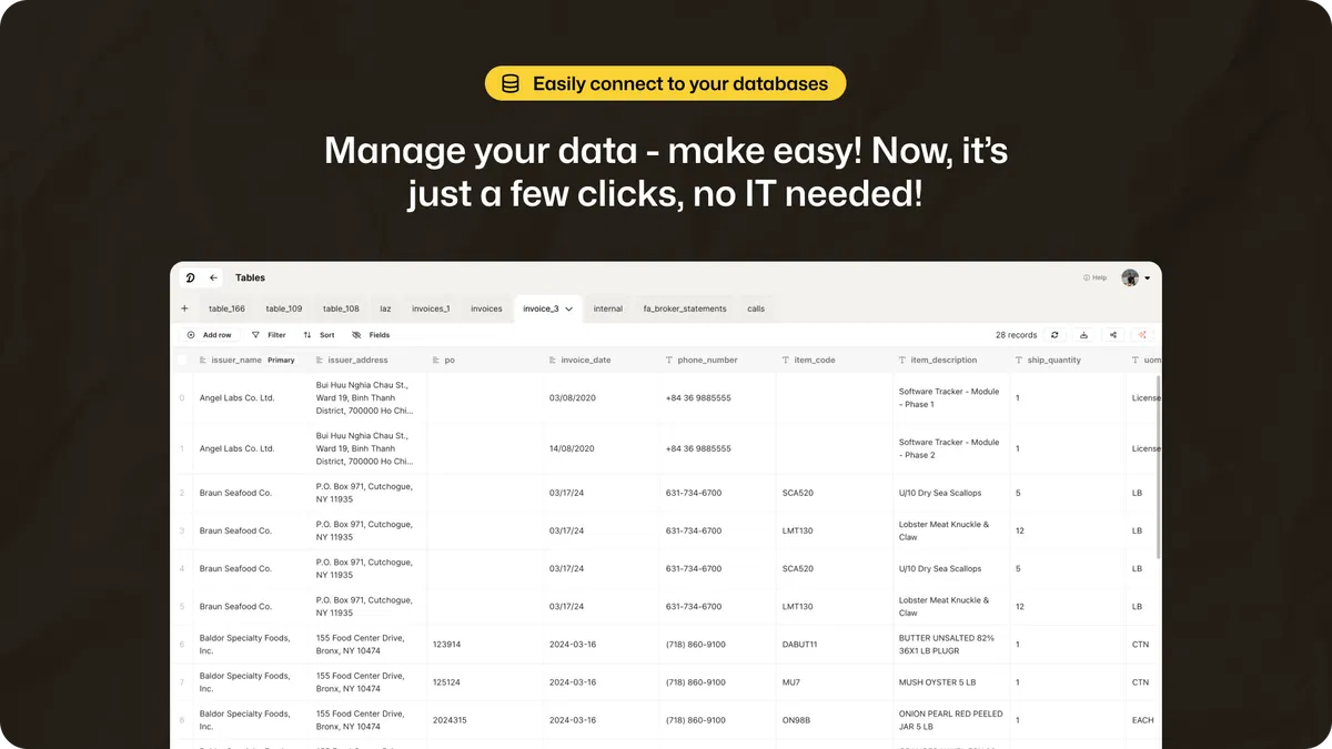 Upload your own data in a CSV file and organize data using smart tables that scale with your business
