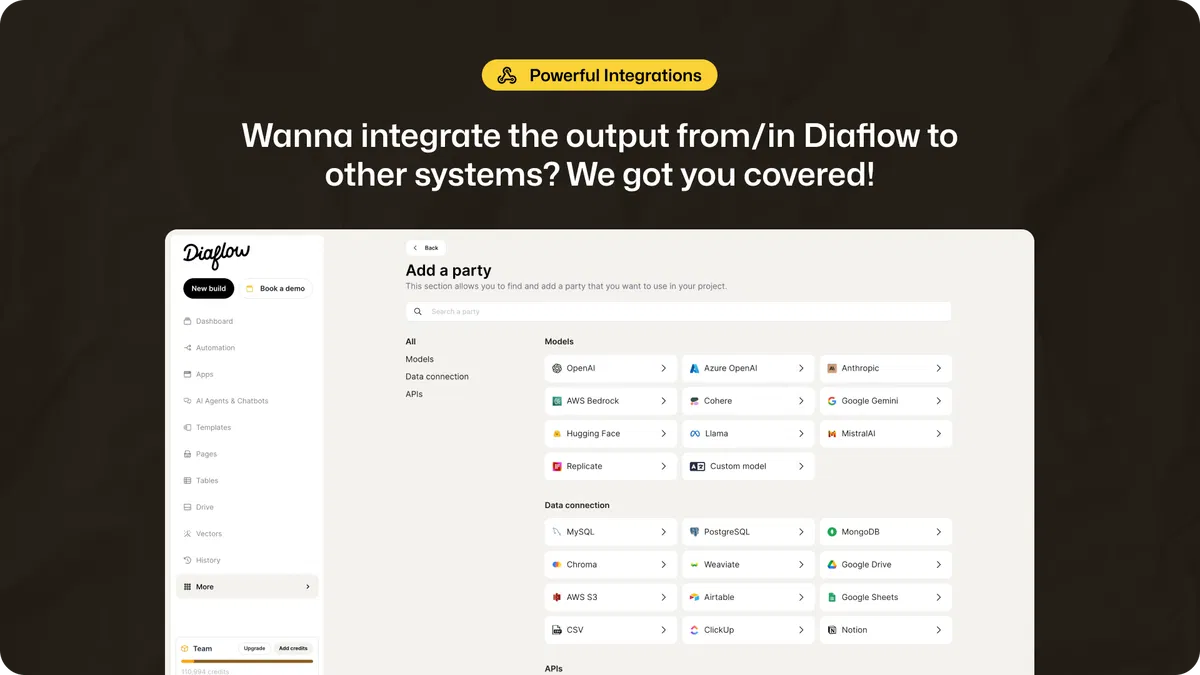 Use advanced AI models from OpenAI, Google, Mistral AI, and more—without your data ever leaving Diaflow