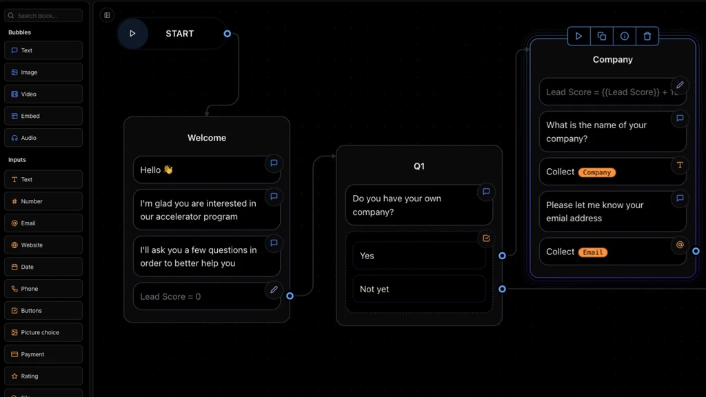 Build AI chatbots that talk naturally and collect info without coding or complex setups. Drag and drop conversation blocks, add conditional logic, and integrate data collection with ease.