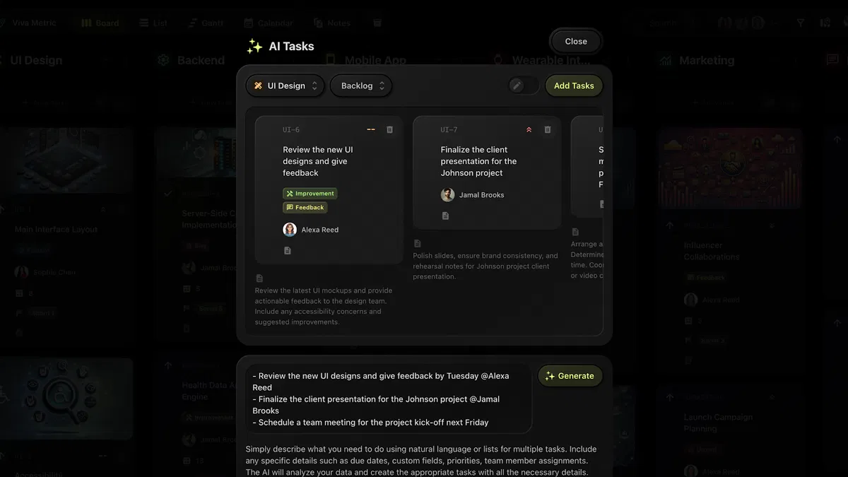 Generate structured tasks with due dates, tags, priorities, and assignees automatically filled in