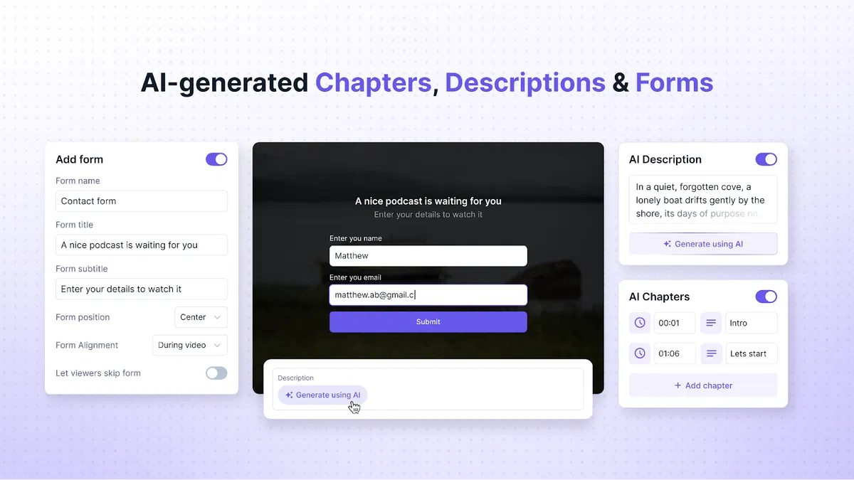 • Auto-generate chapters and descriptions with AI to improve engagement and SEO